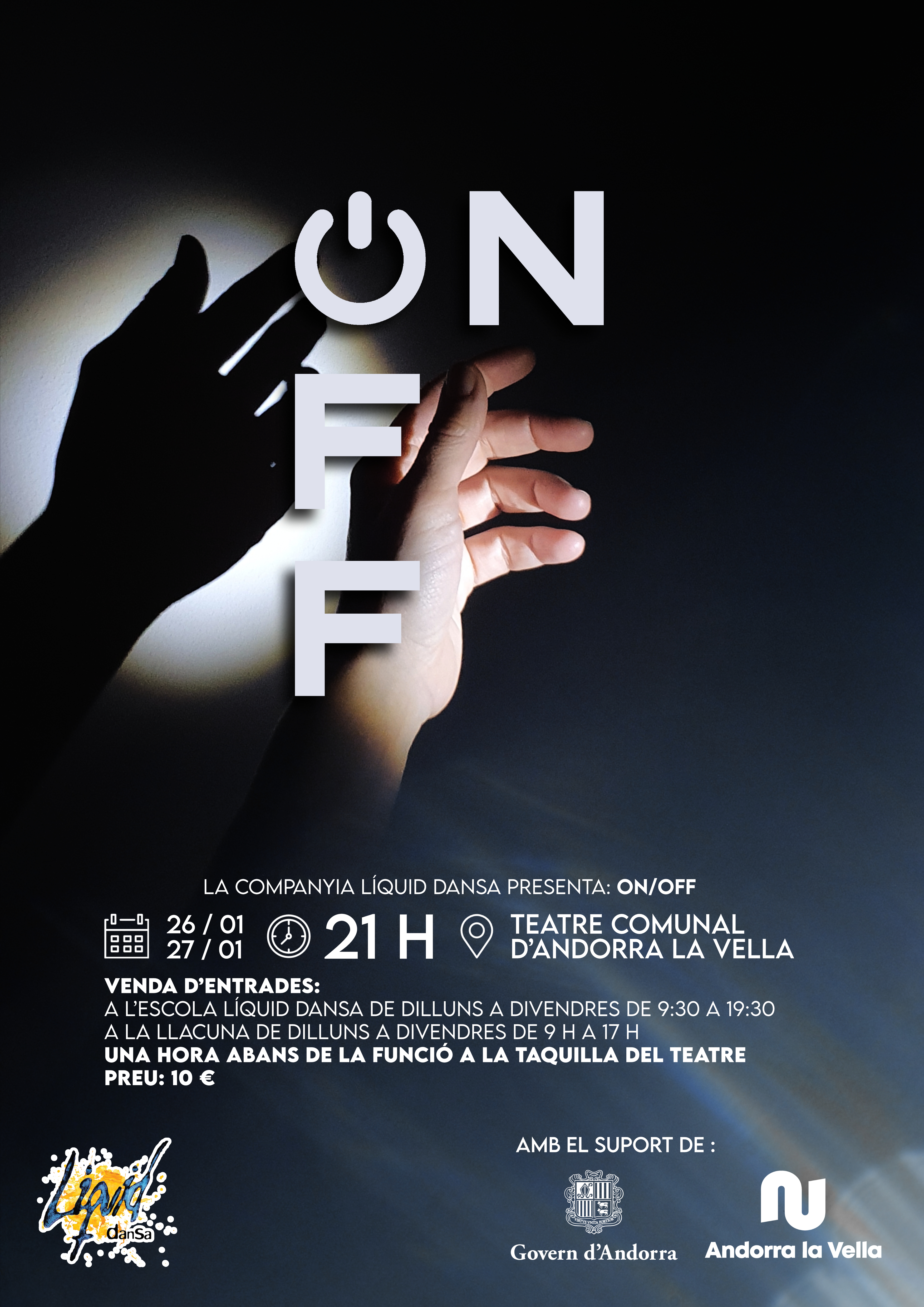 La Cia Líquid Dansa fa un treball d’investigació dels efectes de la llum sobre els cossos, les seves ombres i jocs que conviden al públic a gaudir de la posada en escena. Una obra de creació amb un treball estètic, plàstic i coreogràfic que deixa lloc a la imaginació. On/Off és una proposta dirigida a tots els públics amb coreografies molt diverses, des de solos, duos i peces corals.