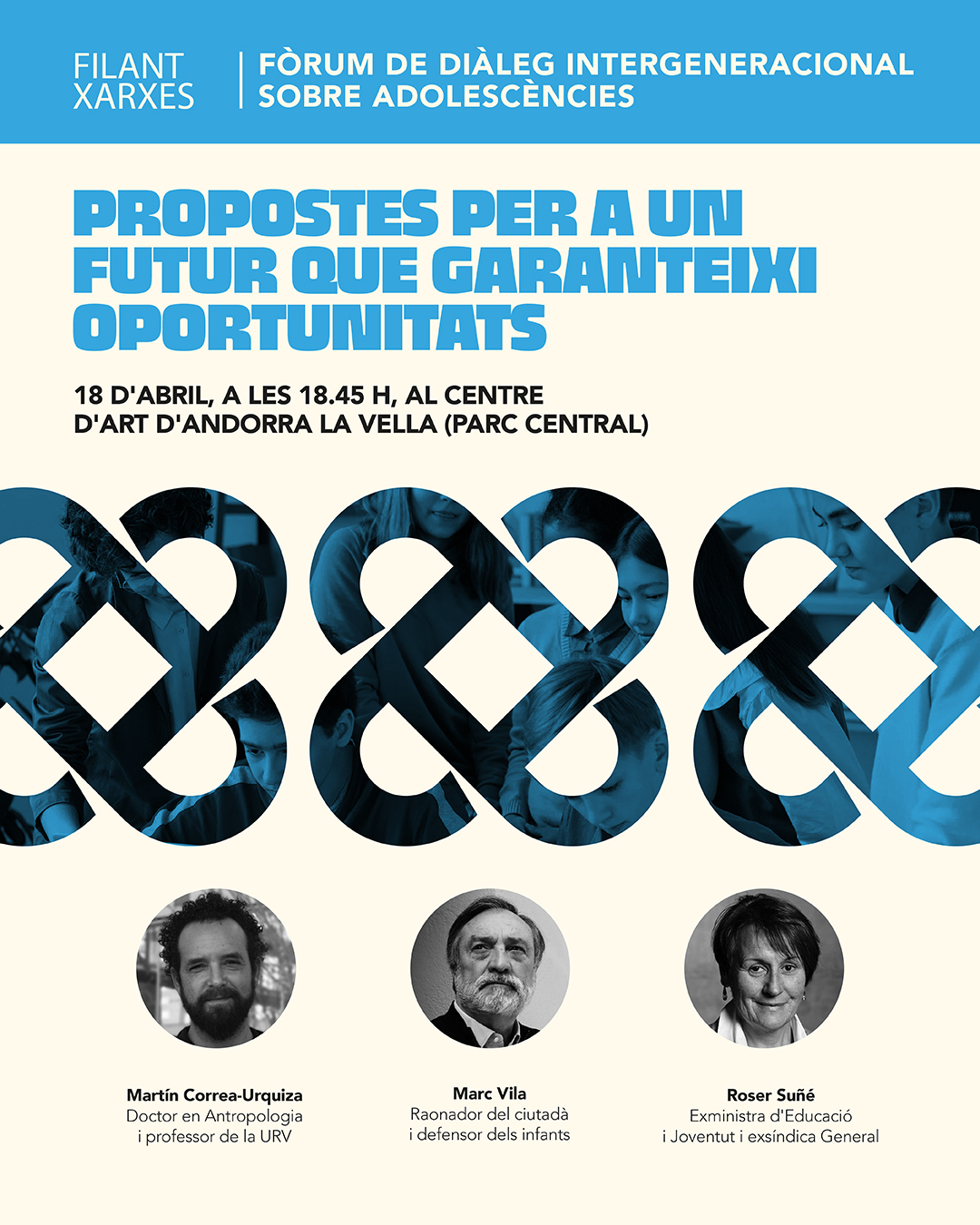 Un fòrum de diàleg intergeneracional sobre adolescències impulsat pel Servei de Joventut del Comú d’Andorra la Vella, amb la col·laboració d’Unicef. L'objectiu és fomentar el diàleg entre els diferents agents que conviuen amb els joves i els mateixos adolescents. La tercera i darrera sessió del 18 d'abril se centrarà en les propostes per a un futur que garanteixi la sostenibilitat.