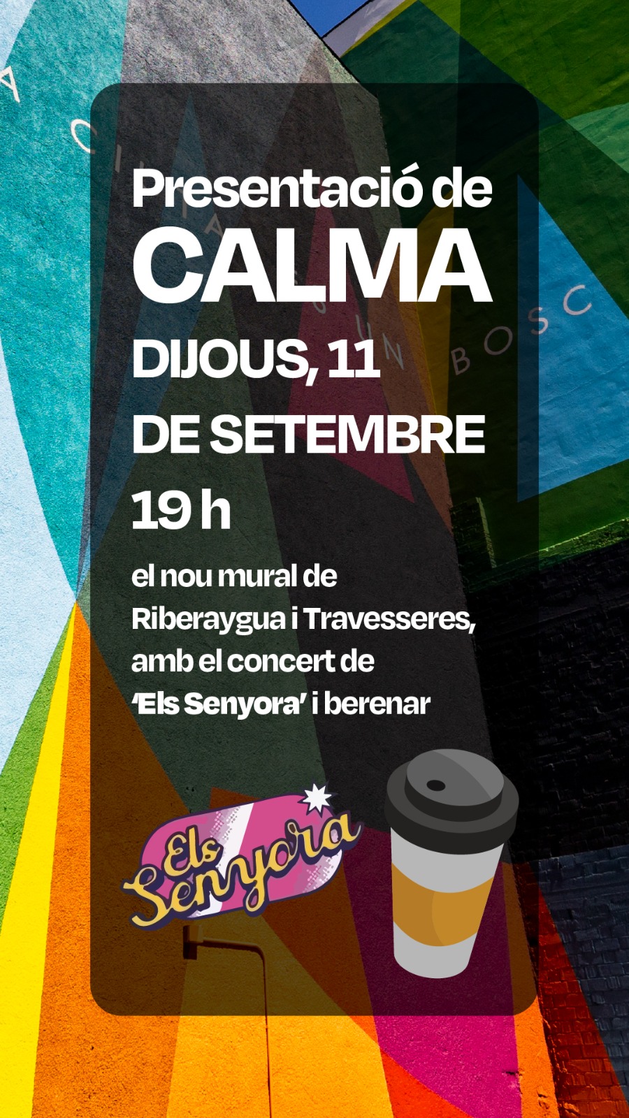 dijous, 11 setembre, 2025 - 19:00Inauguració del nou mural 'CALMA' a Riberaygua i Travesseres Dijous, 11 de setembre 19 hores Concert de 'Els Senyora' i berenar popular!