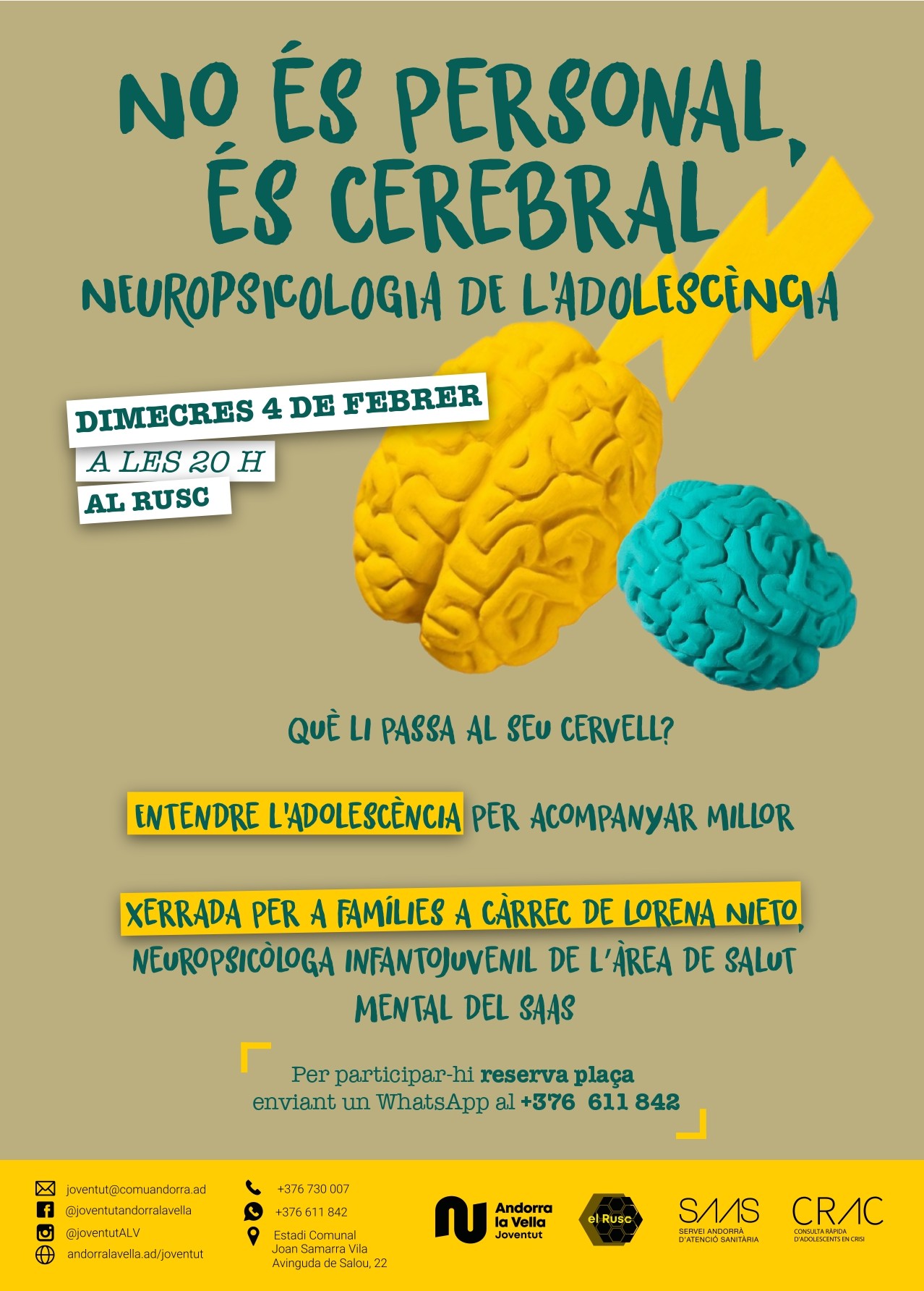 Xerrada adreçada a famílies per entendre què passa al cervell dels adolescents i com aquest procés influeix en la seva manera de pensar, sentir i actuar. La sessió oferirà eines per acompanyar millor aquesta etapa vital des d’una mirada neuropsicològica.