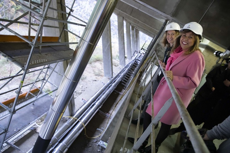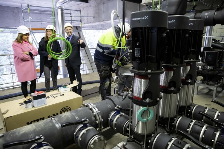 La ministra de Medi Ambient, Agricultura i Sostenibilitat i presidenta de FEDA, Sílvia Calvó, la cònsol major d’Andorra la Vella, Conxita Marsol, el director general de FEDA, Albert Moles, i el gerent de FEDA Ecoterm, Jordi Travé, han visitat les instal·lacions del Centre de Tractament de Residus, d’on parteix la xarxa, i el centre esportiu, que és el primer edifici en connectar-s’hi.