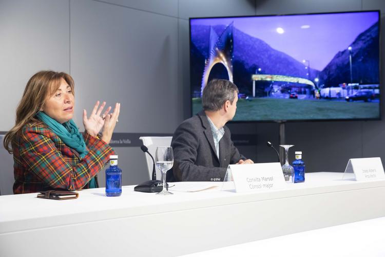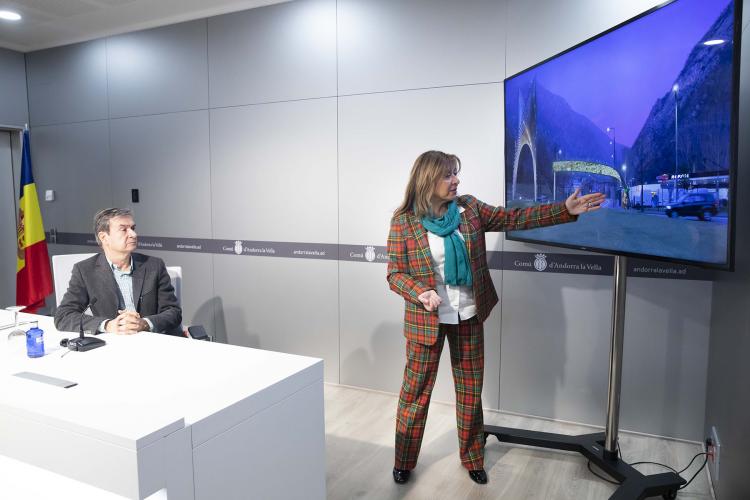La cònsol major, Conxita Marsol, ha presentat el projecte guanyador del concurs nacional d’idees per a la creació d’un portal d’entrada a la parròquia d’Andorra la Vella a la rotonda de la Margineda amb l’objectiu de fomentar el flux de vehicles per l’avinguda d’Enclar. Ho ha fet acompanyada de l’arquitecte Josep Adserà, encarregat de desenvolupar el projecte.
