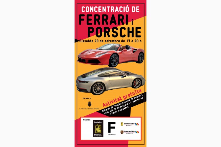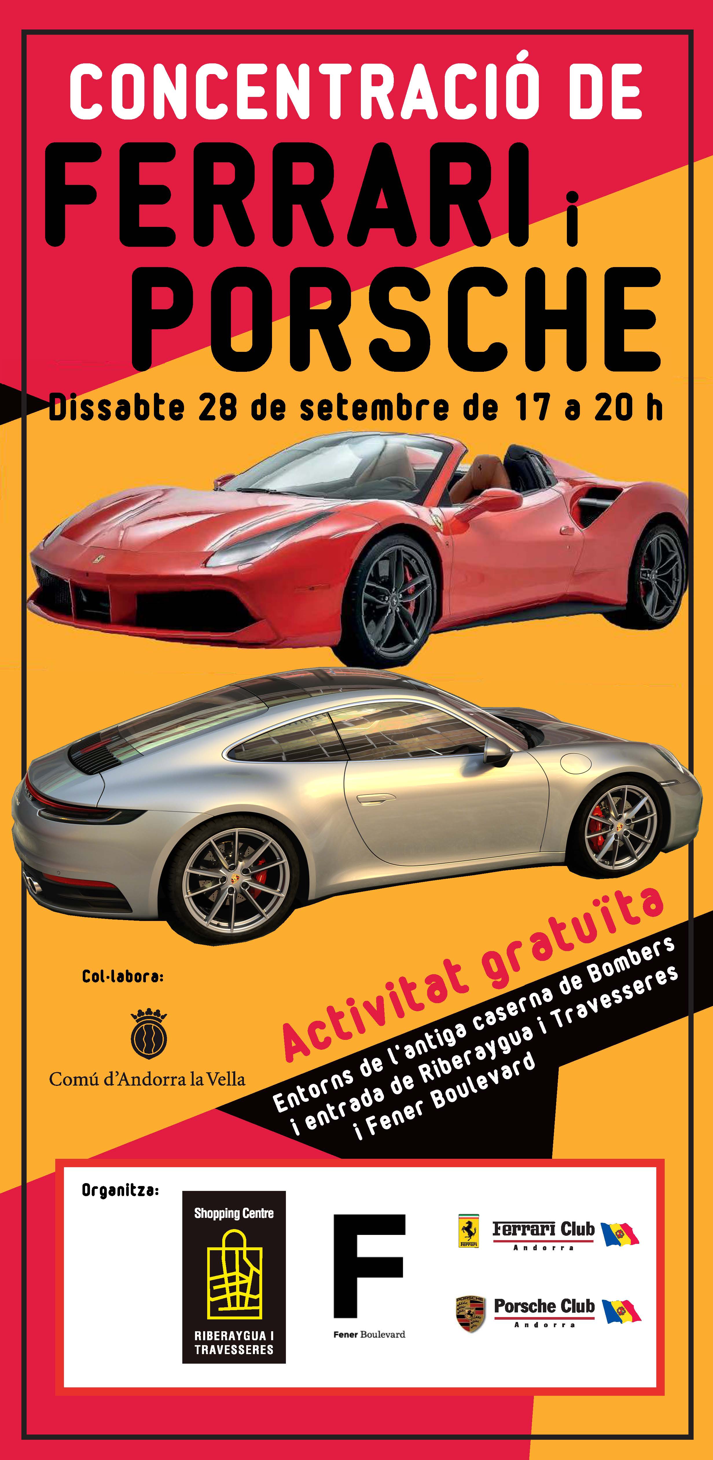 Més d’un centenar de Ferraris i Porsches s’exposaran aquest dissabte, 28 de setembre, a l’entrada de Riberaygua i Travesseres i Fener Boulevard i als entorns de l’antiga caserna de bombers. La concentració és una activitat de dinamització organitzada per les associacions de comerciants de Riberaygua i Travesseres i Fener Boulevard en el marc de l’11a concentració de Ferrari i Porsche que impulsen aquest cap de setmana el Ferrari Club i el Porsche Club d’Andorra. L’activitat es du a terme amb la col·laboració del Comú d’Andorra la Vella.