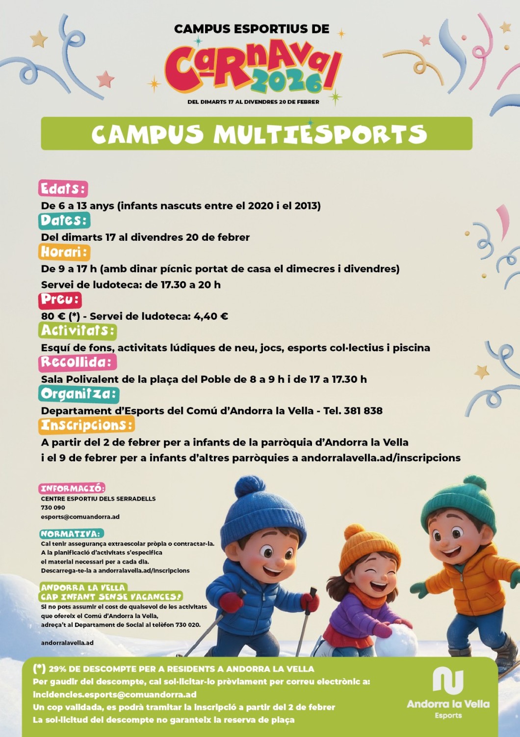 Per gaudir del descompte per a residents i poder inscriure's abans del 9 de febrer cal sol·licitar-ho prèviament per correu electrònic a incidencies.esports@comuandorra.ad. Un cop validat es podrà tramitar la inscripció a partir del 2 de febrer.