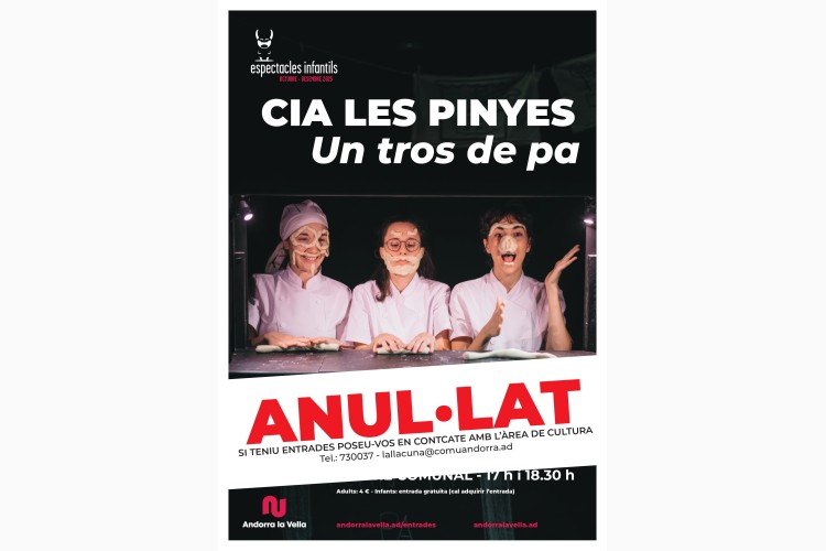 El Comú d’Andorra la Vella informa que l’espectacle Un tros de pa, de la companyia Les Pinyes, i organitzat en col·laboració amb l’ONCA, queda anul·lat. Les dues sessions previstes per a aquest dissabte 13 no es podran realitzar per motius aliens al Comú.