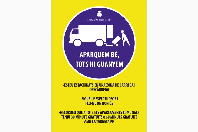 Sota l'eslògan 'Aparquem bé, tots hi guanyem', el Comú d'Andorra la Vella ha posat en marxa una campanya de sensibilització perquè les zones de càrrega i descàrrega s'ulitizin de manera correcta. Està adreçat sobretot a persones que abusen d'aquests espais temporals d'aparcament, com "lampistes que van a fer una reparació en una casa" o "comercials que van a fer una comanda en un restaurant", ha exposat el conseller de Serveis Públics i Circulació, Miquel Canturri. Durant els primers tres mesos els agents de circulació posaran un paper informatiu a aquells vehicles mal estacionats, però passat aquest període "començarem a sancionar i a emportar-nos cotxes amb la grua", ha informat Canturri.