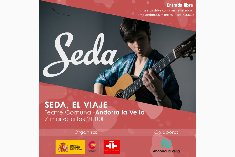 En el marc del Dia Internacional de la Dona, l’Ambaixada d’Espanya a Andorra i l'Extensió a Andorra de l’Institut Cervantes de Toulouse, en col·laboració amb el Comú d’Andorra la Vella, organitzen el concert de guitarra SEDA, a càrrec de l’artista Silvia Nogales Barrios, que tindrà lloc al Teatre Comunal d’Andorra la Vella el dijous 7 de març de 2024, a les 21 hores.
