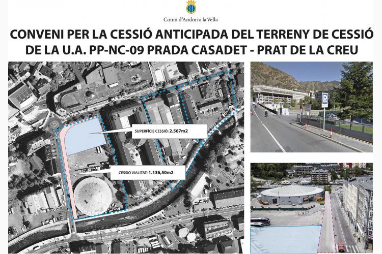 El Comú d’Andorra la Vella ha obtingut una parcel·la de 2.567 m² enfront del Govern –l’àrea més propera al carrer Prat de la Creu de l’actual aparcament d’autobusos–, com a conseqüència de la negociació que va permetre la cessió anticipada de terrenys facilitada ara fa un any pels germans Vinyes. El Comú d’Andorra la Vella vol construir-hi un element que constitueixi un pol d’atracció, trobada i interconnexió del centre administratiu, el Centre Històric i el Centre Ciutat i comercial.