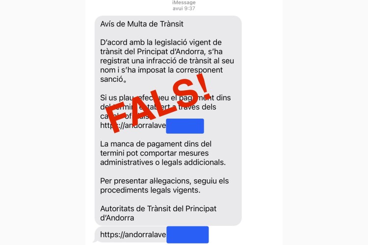 Els missatges, que arriben al telèfon mòbil dels usuaris, informen d’una presumpta sanció de trànsit i inclouen un enllaç per efectuar-ne el pagament. El Comú vol deixar clar que aquestes comunicacions no són oficials, que no provenen de cap servei parroquial ni administració pública, i que es tracta d’un intent d’obtenir dades personals o bancàries de manera il·legítima.