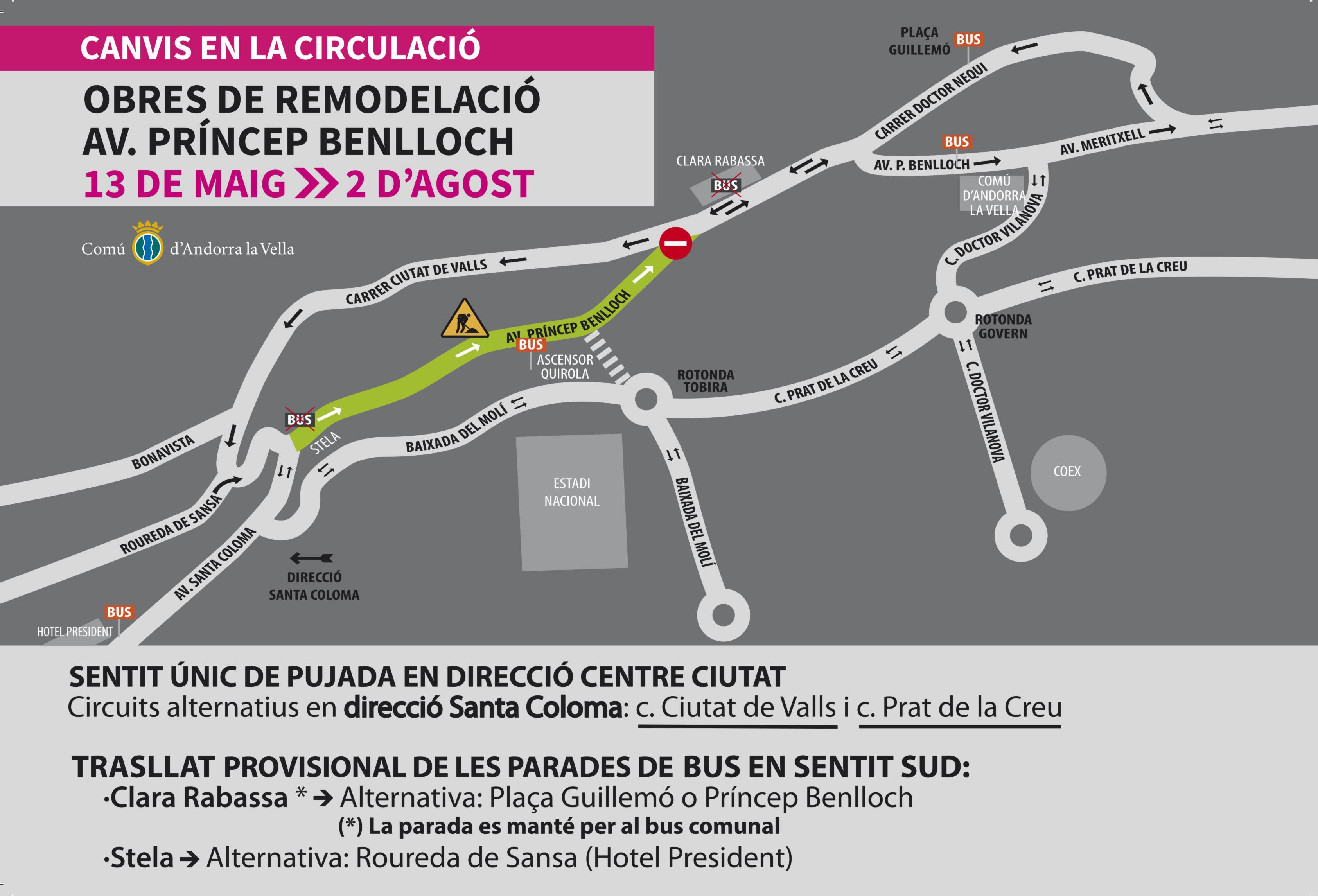 El Comú s’ha coordinat amb l’Àrea de Mobilitat i el servei de Transport escolar per informar dels canvis que afectaran el trànsit i el bus escolar a partir del proper dilluns, que són conseqüència dels treballs de remodelació de l’avinguda Príncep Benlloch i que consistiran a eixamplar les voravies (la mitjana que s’aconseguirà és de 2,5 metres a banda i banda), a millorar l’enllumenat, a instal·lar contenidors soterrats i passos de vianants elevats per pacificar el trànsit (la zona passarà a ser de 30 km/h), a banda de col·locar punts d’estacionament de rotació amb un període màxim de 30 minuts per afavorir l’activitat comercial, i una àrea d’aparcament per a motos i una altra de càrrega i descàrrega.