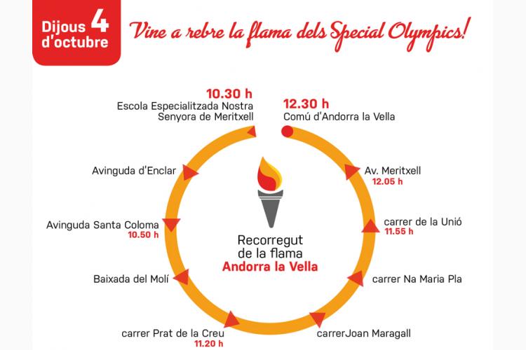 La torxa olímpica que donarà inici, demà a la tarda, als Jocs Special Olympics d’Andorra la Vella i La Seu d’Urgell arribarà demà al matí a la parròquia, després de recórrer durant dues setmanes diferents poblacions catalanes on s’han realitzat els Jocs anteriorment. La flama sortirà a les 10.30 hores des de l’Escola Especialitzada Nostra Senyora de Meritxell i recorrerà l’avinguda d’Enclar, l’avinguda Santa Coloma, la Baixada del Molí, el carrer Prat de la Creu, el carrer Joan Maragall, el carrer Na Maria Pla fins al carrer de la Unió i l’avinguda Meritxell fins acabar el recorregut al Comú d’Andorra la Vella cap a les 12.30 hores. Des de l’organització dels Jocs es convida tota la ciutadania a sortir al carrer per donar suport als esportistes durant el recorregut.