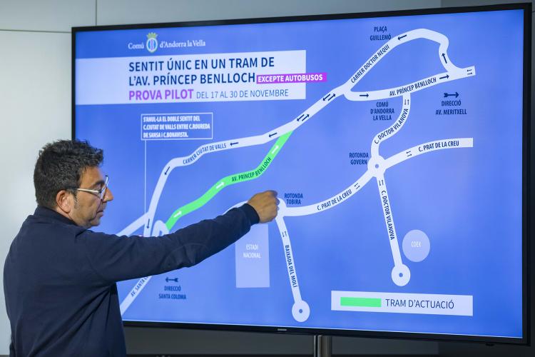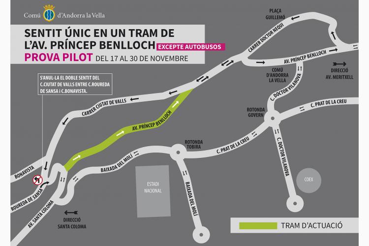 El Comú d’Andorra Vella engegarà aquest dissabte, 17 de novembre i durant dues setmanes (fins el 30 de novembre) una prova pilot per limitar a un únic sentit de pujada un tram de la circulació de l’avinguda Príncep Benlloch: des de la cruïlla amb la Baixada del Molí fins a la cruïlla amb el carrer Ciutat de Valls. Per tant, els vehicles que vulguin anar cap a la zona de l’avinguda Meritxell o Prat de la Creu podran fer-ho per l’avinguda Príncep Benlloch. En canvi, en sentit sud no s’hi podrà circular. Per anar cap a Santa Coloma el Comú recomana agafar la ruta del carrer Doctor Vilanova, Prat de la Creu i la Baixada del Molí, tal com ha explicat el conseller de Serveis Públics i Circulació, Miquel Canturri.