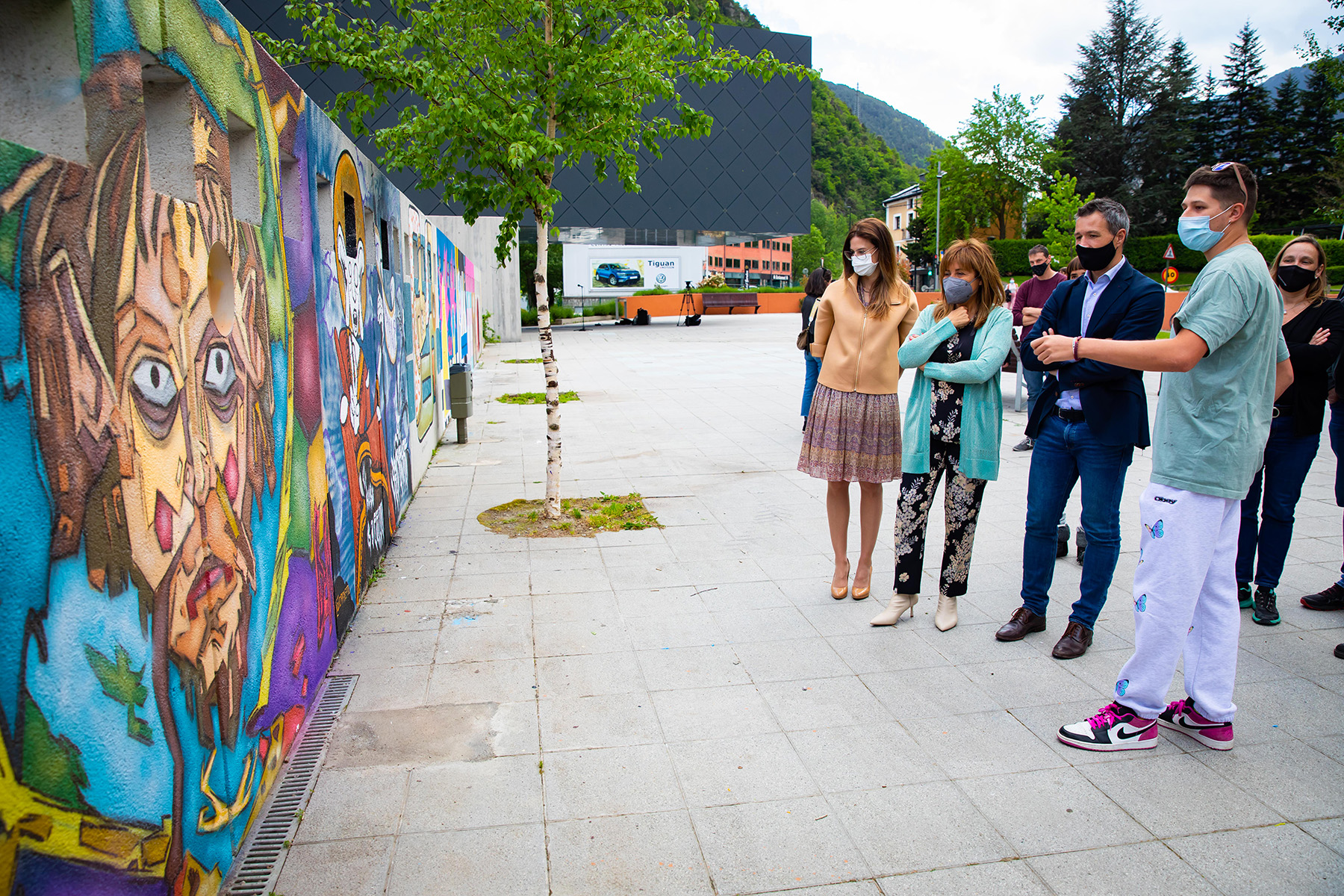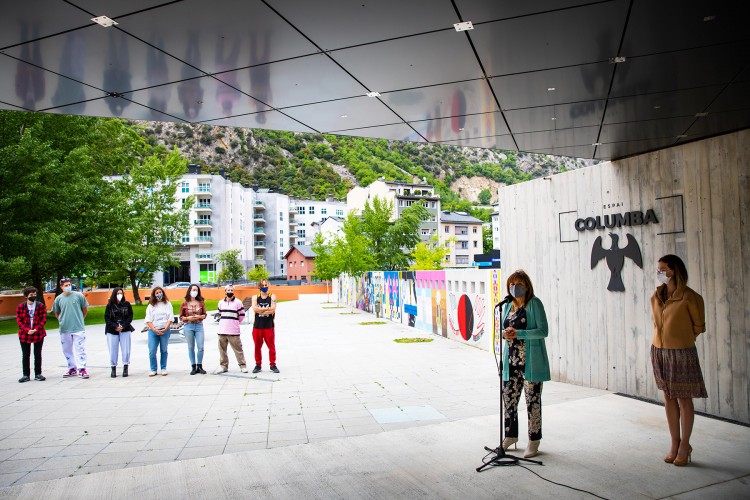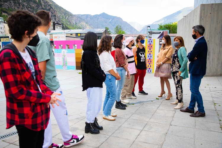 La ministra de Cultura i Esports, Sílvia Riva, acompanyada dels cònsols major i menor d’Andorra la Vella, Conxita Marsol i David Astrié, ha visitat aquest divendres a la tarda el nou mural urbà ubicat a l’exterior de l’Espai Columba.