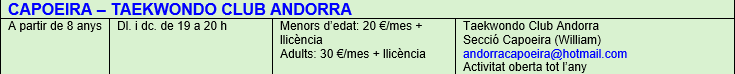 Classe de taekwondo a partir dels 3,5 anys i per a adults. Equips de competició que participen en els campionats de Catalunya i Espanya amb projecció internacional. Classes de capoeira. Taekwondo Club Andorra Secció Capoeira (William).