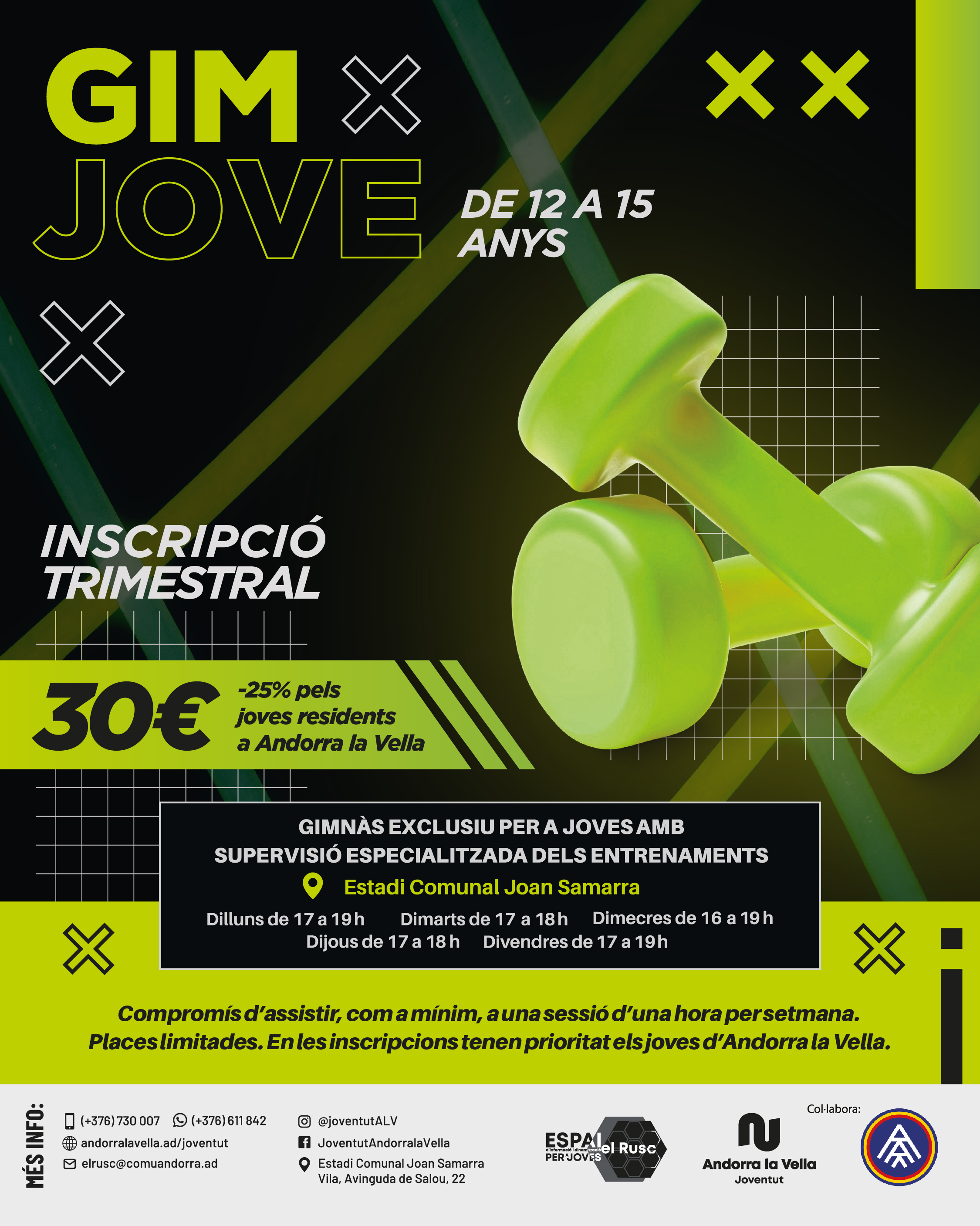 - Per apuntar-te al Gim Jove, descarrega't la inscripció pel trimestre GENER-MARÇ 2026 ent clic aquí i un cop omplert envia'l per WhatsApp al 611 842 o bé a joventut@comuandorra.ad