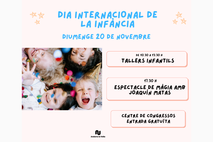 Les escoles bressol i els espais de lleure del Comú d’Andorra la Vella duen a terme durant tota aquesta setmana un seguit d’activitats per celebrar el dia internacional de la infància que es commemora el diumenge 20 de novembre. Els actes es clouran el mateix diumenge amb propostes gratuïtes i obertes a tothom al Centre de Congressos d’Andorra la Vella: jocs de fusta i un taller per construir una joguina de fusta al matí; i un espectacle de màgia per a tota la família a la tarda hores a càrrec de Joaquín Matas.