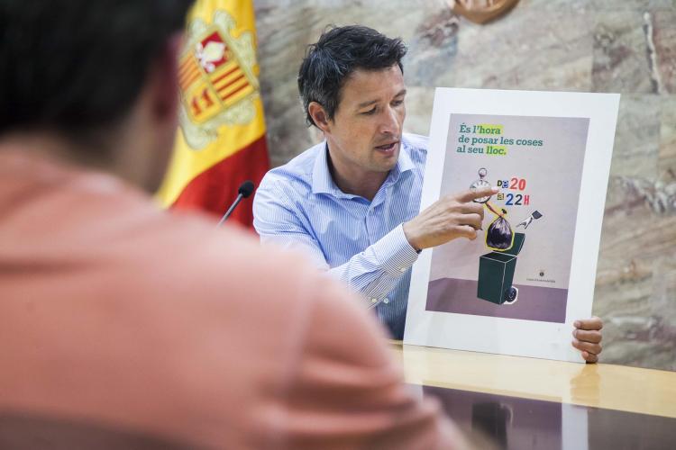 El conseller de Medi Ambient i Innovació, David Astrié, ha presentat la nova campanya per fomentar el civisme a l’hora de treure les deixalles, que s’han de llençar als contenidors dels edificis només entre les 8 i les 10 del vespre, tal com marca l’ordinació de la higiene pública. Per això l’eslògan ‘És l’hora de posar les coses al seu lloc’ vol incidir en aquest aspecte.