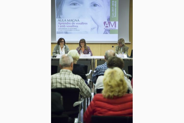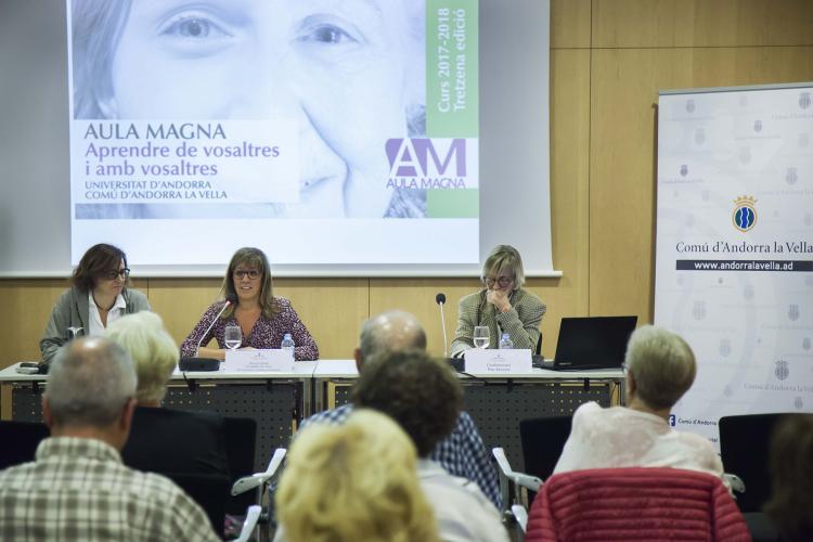Encetat el nou curs de l’Aula Magna 2017-2018, que enguany porta per títol 'Aprendre de vosaltres i amb vosaltres'. El Centre de congressos d’Andorra la Vella, aquest dijous a la tarda, ha acollit la conferència inaugural ‘Envelliment actiu i formes de vida en un món líquid’, a càrrec de la professora Pilar Monreal, que ha explicat als assistents que l’envelliment actiu s'aplica a aquella gent jubilada que decideix sobre la seva pròpia vida, participa de la vida ciutadana i té una actitud d’iniciativa. Es basa en un estudi que ha desenvolupat en l’àmbit rural català i que creu que es pot extrapolar a Andorra. “No són consumidors de serveis sinó que s’activen com a ciutadans”, ha reafirmat.