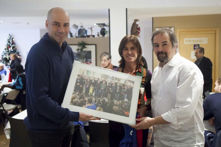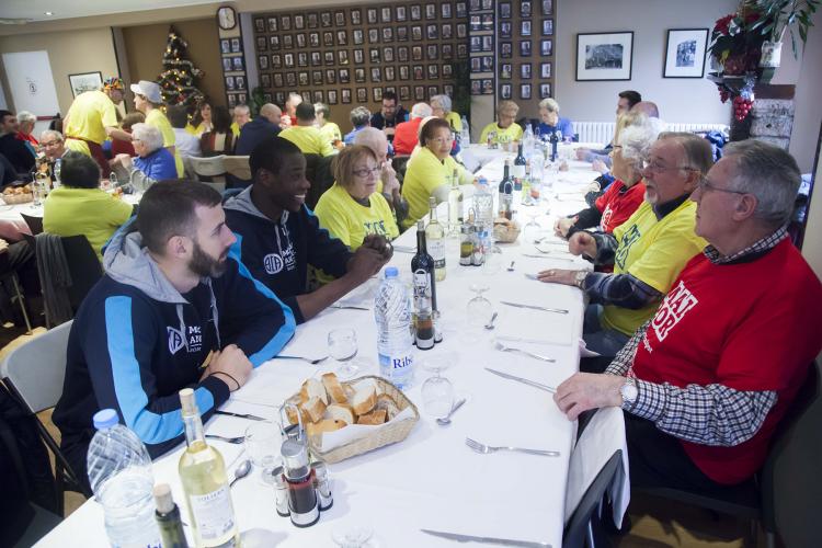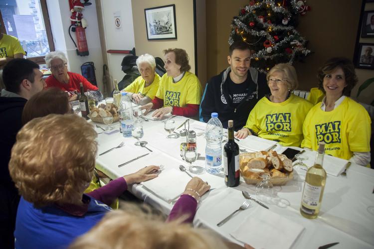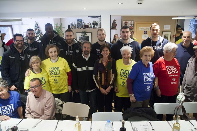 La plantilla de l’equip de bàsquet ha dinat amb els usuaris de l’hostal Calones d’Andorra la Vella, que els han acollit amb samarretes grogues, blaves i vermelles amb el lema de l’equip ‘Mai por’.