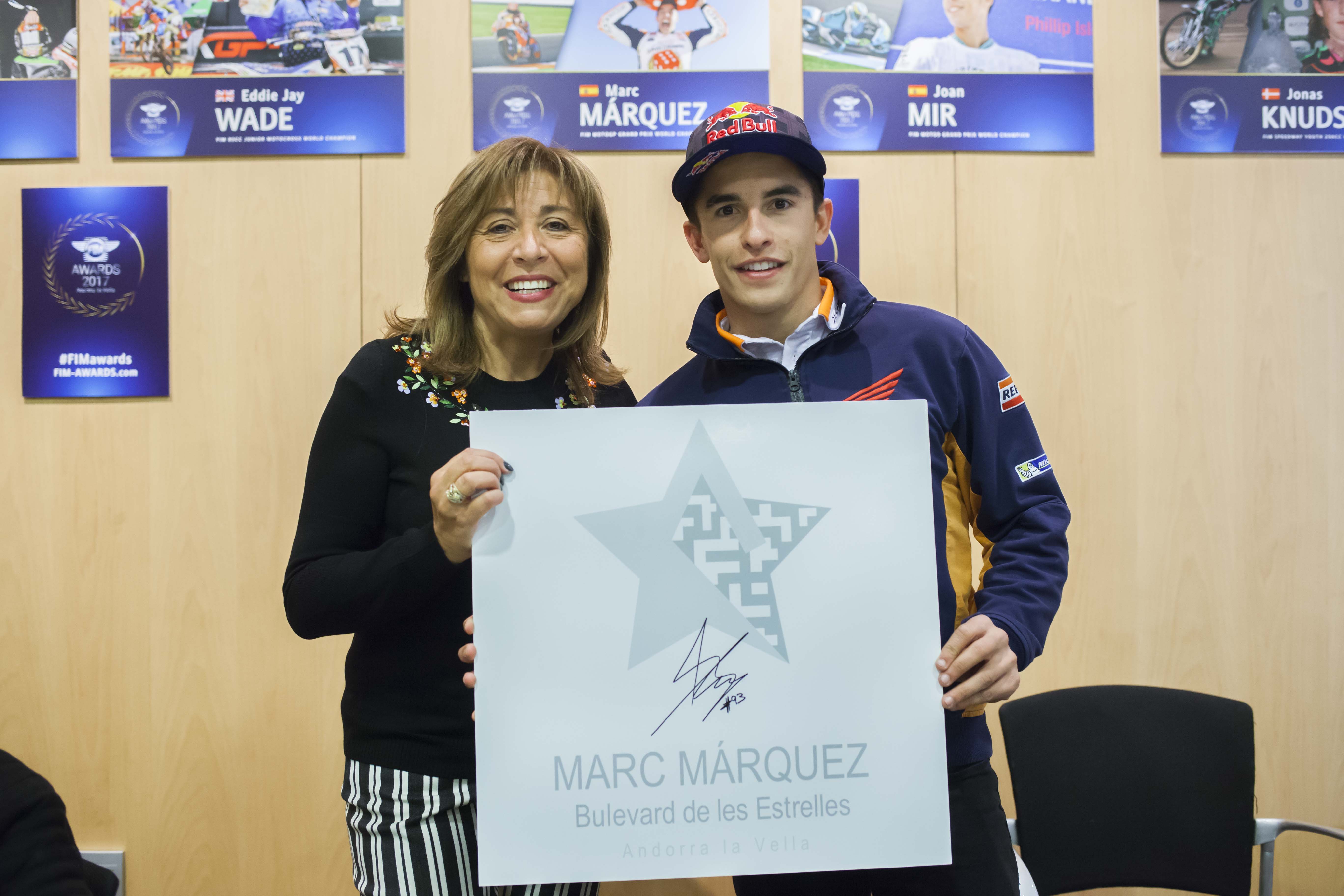 Durant l’estada dels campions del món de totes les disciplines a Andorra la Vella aquest cap de setmana, amb motiu del lliurament dels FIM Awards, el campió de Moto GP, Marc Márquez, i el campió de trial, Toni Bou, han accedit a ser presents al Boulevard de les estrelles. Tots dos ja han signat les plaques que s’instal·laran d’aquí a unes setmanes al terra del Fener Boulevard (la marca comercial del carrer Na Maria Pla).