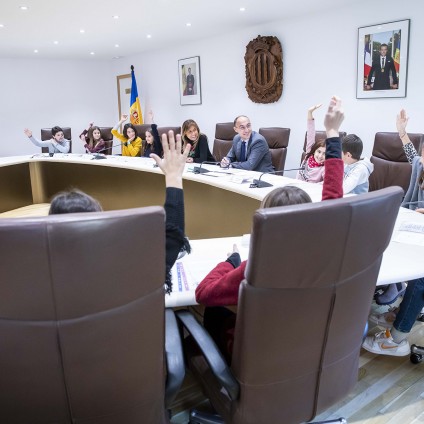 Aquest matí s’han nomenat els dotze nous consellers infantils dels centres educatius de la parròquia, als quals se sumen enguany els del British College of Andorra. Pantalles digitals a la via pública, màquines de reciclatge d’envasos i casetes de fusta per als ocells i els gats del carrer, algunes de les idees exposades pels escolars.